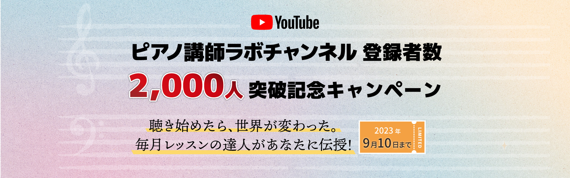 今年の1月から本格スタートした、YouTube「ピアノ講師ラボチャンネル」。チャンネル登録者数2,000名の突破を記念した、特別なキャンペーンを実施いたします。9月10日までのご入会で、数々の特典を受け取りながら、新しい学びをスタートいただけます。